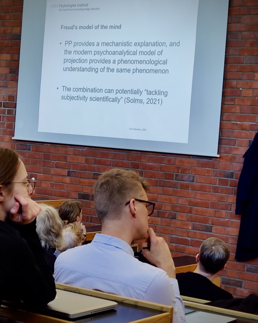 Lounaan jälkeen esityksen pitää koulutusanalyytikko, kliinisen psykologian apulaisprofessori Erik Stänicke Oslon yliopistosta otsikkonaan ”Freuds model of the mind within a predictive-processing neuroscientific paradigm”. Hän on juuri saanut tietää artikkelinsa tulevan julkaistavaksi informaatiotieteisiin keskittyvässä Entropy -lehdessä. Hän kuvaa mielen toimintaa havaintoparadigman kautta (PP – Predictive Processing paradigm), jossa painotetaan yllätyksellisyyttä (surprise) tekijänä, joka edesauttaa mielen muutosta, toisin kuin perinteisessä psykoanalyysissa, jossa itseymmärryksen lisääminen on nähty mielen muutoksen vaikuttajana.